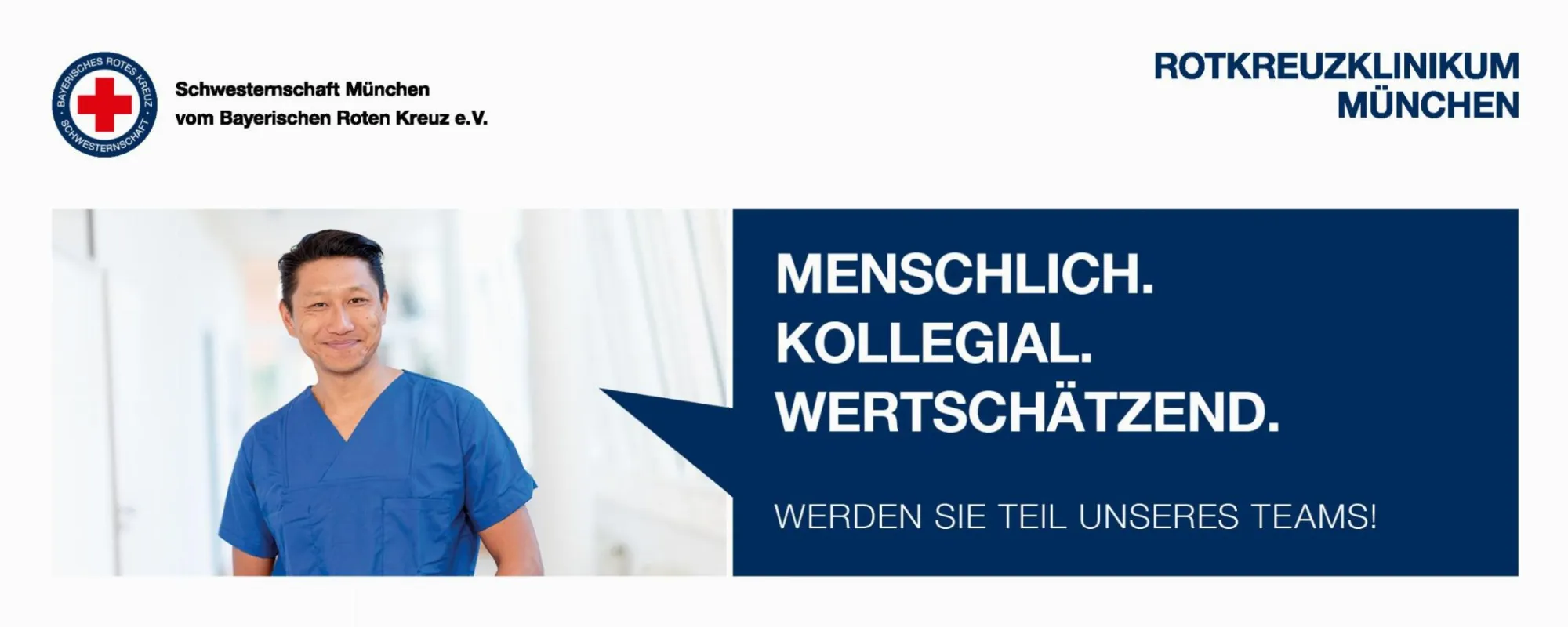 Willkommen im Rotkreuzklinikum München! Wir stehen in München traditionell für Medizin auf höchstem Niveau und eine professionelle, menschlich zugewandte Pflege. Wir sind ein akademisches Lehrkrankenhaus sowie Schwerpunktversorger mit interdisziplinären Fachabteilungen und Medizinischen Kompetenzzentren. Als Gesellschaft der Schwesternschaft München vom Bayerischen Roten Kreuz e.V. arbeiten wir nach den Grundsätzen des Deutschen Roten Kreuzes – wir betreuen Menschen in Not ohne Unterscheidung nach Herkunft, sozialer Stellung, Nationalität oder Religion.