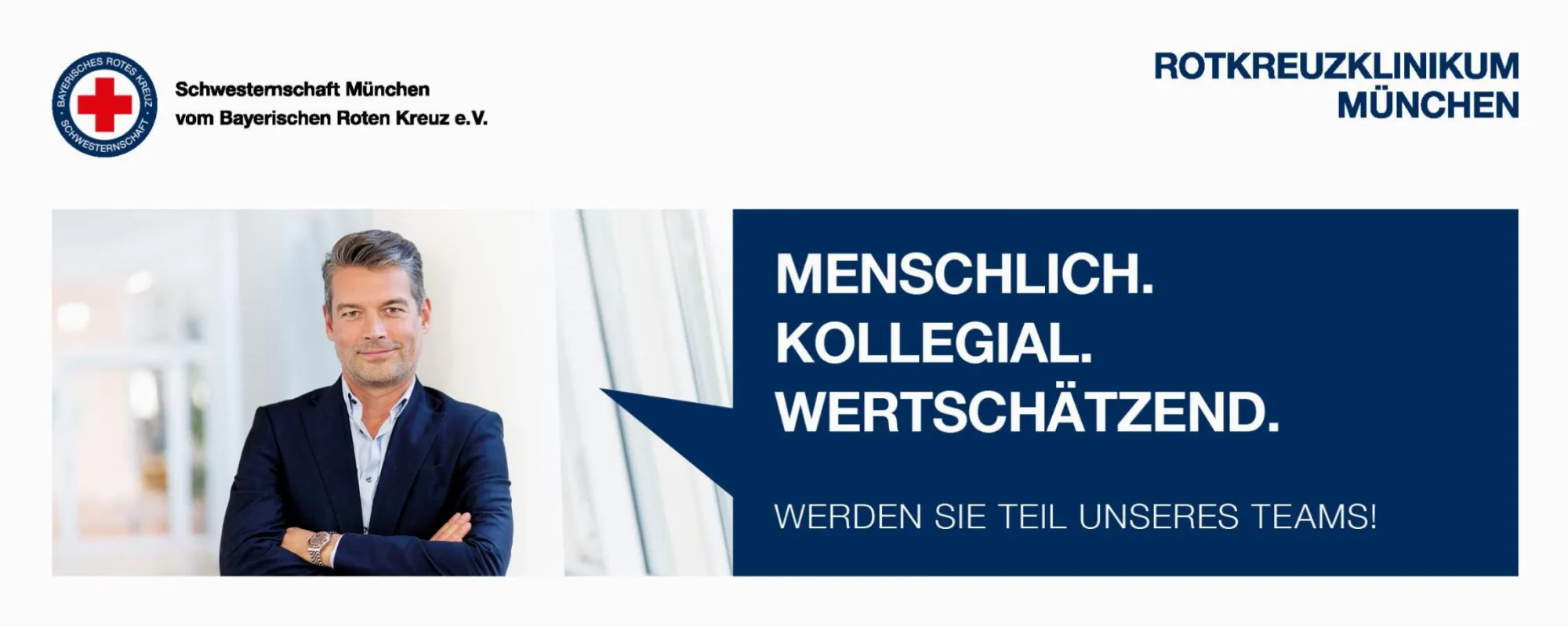 Willkommen im Rotkreuzklinikum München! Wir stehen in München traditionell für Medizin auf höchstem Niveau und eine professionelle, menschlich zugewandte Pflege. Wir sind ein akademisches Lehrkrankenhaus sowie Schwerpunktversorger mit interdisziplinären Fachabteilungen und Medizinischen Kompetenzzentren. Als Gesellschaft der Schwesternschaft München vom Bayerischen Roten Kreuz e.V. arbeiten wir nach den Grundsätzen des Deutschen Roten Kreuzes – wir betreuen Menschen in Not ohne Unterscheidung nach Herkunft, sozialer Stellung, Nationalität oder Religion.