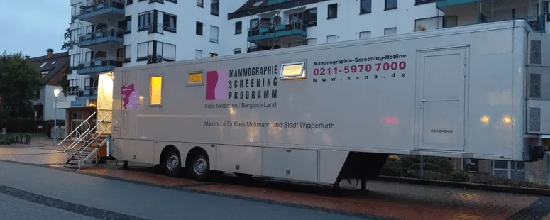 Unsere mobile Screening-Einheit steht jeweils 6 bis 8 Wochen an einem Standort und ist überwiegend im Bergischen Land sowie im Kreis Mettmann an wechselnden Einsatzorten stationiert, unter anderem in Velbert, Mettmann, Wipperfürth, Erkrath, Heiligenhaus und Wülfrath.
